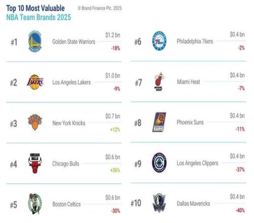 英國(guó)品牌評(píng)估機(jī)構(gòu)Brand Finance發(fā)布“2025美國(guó)職業(yè)籃球聯(lián)賽品牌價(jià)值30強(qiáng)”(Top 30 most valuable NBA team brands)排行榜。金州勇士隊(duì)、洛杉磯湖人隊(duì)、紐約尼克斯隊(duì)列前三位。