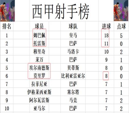 射手榜方面,姆巴佩18球繼續(xù)領(lǐng)跑,托雷斯11球位列第2,穆里奇10球排在第3,萊萬9球位列第4。莫里羅今天傳射建功,追上埃爾南德斯,兩人8球并列第5。拉菲尼亞,亞馬爾和阿爾瓦雷斯等人7球剛好擠入前十。