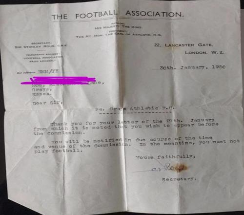 長話短說,格雷斯競技隊被懷疑發放靴錢。這封信證實了我爺爺愿意參與委員會的調查。在調查結果出來之前,他被禁止參賽。