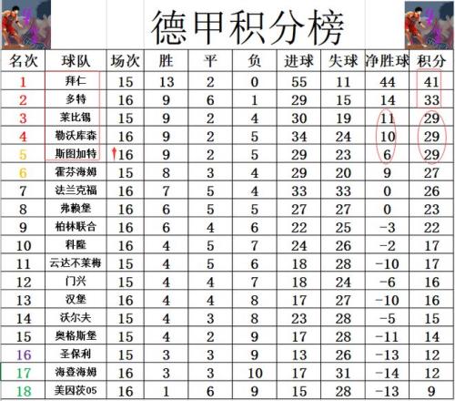 積分榜方面,拜仁13勝2平繼續保持不敗,少賽1場領先多特8分高居榜首。勒沃庫森慘敗后,凈勝球少了萊比錫1個“自動”跌出前3,萊比錫躺進前3,斯圖加特大勝后追了上來,凈勝球劣勢排在第5。