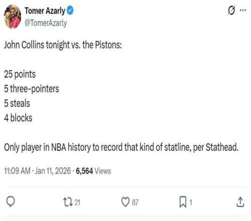 憑借這樣的表現(xiàn),科林斯成為NBA歷史上首位單場(chǎng)至少拿下25分、5記三分、4次搶斷、4次蓋帽的球員。