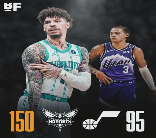 黃蜂在客場贏了爵士55分,這是NBA常規賽客場第三大分差。NBA歷史上客場最大贏球分差是2021年5月1日,步行者152-95狂勝雷霆57分。此役黃蜂三分球59中24,爵士三分只有31中7。光三分球這一項差了17個,也就是51分。