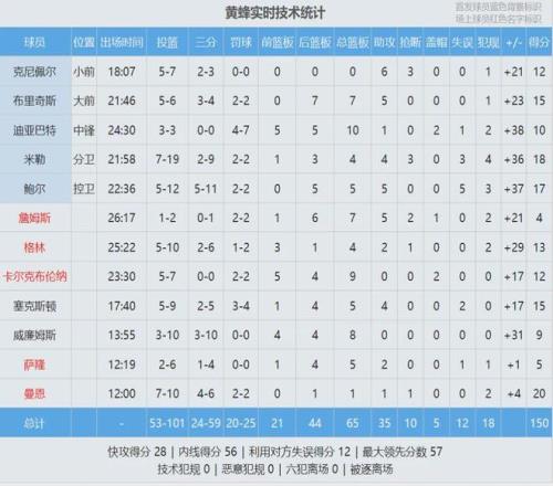 單場150分是黃蜂隊史第二高分,隊史最高分是158分。單場凈勝55分,是黃蜂隊史最大贏球分差。黃蜂9人得分上雙,只有1人得分上20。特雷-曼恩替補出戰12分鐘,12投7中砍下20分,全隊最高。三球重回首發陣容,12中5得到17+5+5!