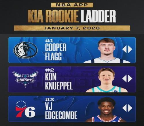 黃蜂4號秀克尼佩爾只打了18分鐘,7投5中得到12分6籃板3搶斷。最近5場比賽,克尼佩爾只有1場得分超過20。賽季場均得分跌至19.2分,依然略高于弗拉格(19.1)。最近一期官方新秀榜,前三位沒有變化,弗拉格繼續領跑。