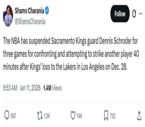 11日早ESPN名記Shams突然在社媒放出重磅消息,曝出國(guó)王后衛(wèi)施羅德被禁賽3場(chǎng),原因是在12月29日湖人對(duì)陣國(guó)王賽后40分鐘,施羅德與湖人一名球員發(fā)生沖突,并試圖毆打?qū)Ψ健?/p>