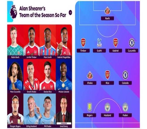 英超官方發(fā)布了阿蘭-希勒評選的英超本賽季至今最佳陣容,哈蘭德領(lǐng)銜,賴斯、凱塞多、扎卡等人在列。