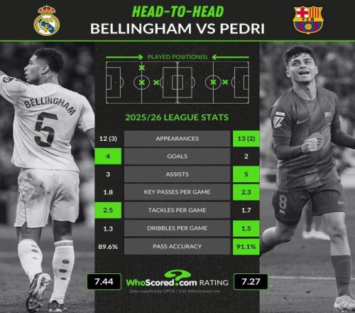 WhoScored統計貝林厄姆和佩德里本賽季至今西甲數據:
