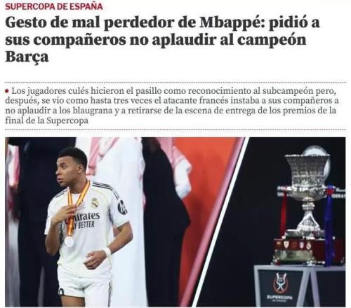 更有意思是的,在比賽結束后的頒獎典禮中,皇馬球員姆巴佩要求隊友們不要為巴薩鼓掌,雖然在賽后巴薩球員為皇馬球員進行了列隊,但姆巴佩被拍到三次督促隊友不要為巴薩鼓掌,并示意大家盡快離開決賽頒獎典禮現場,而姆巴佩的這一舉動也被不少球迷和媒體批評太小氣!