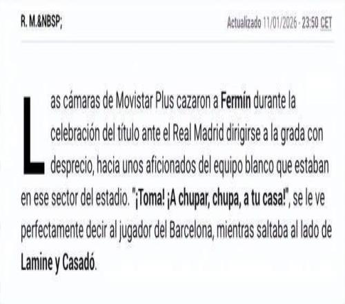而在本場比賽結束后,西班牙媒體《馬卡報》在報道中指出,巴薩部分球員有侮辱皇馬球迷的行為,該媒體表示,巴薩球員費爾明在賽后邊跳邊對著皇馬球迷看臺喊話,大致的意思是“回家吃奶去吧!”。此外,還有媒體捕捉到,賽后巴薩球員庫巴西對著皇馬球迷看臺做出了剪刀手的手勢,而這個手勢在西班牙則類似于國內豎中指的手勢。
