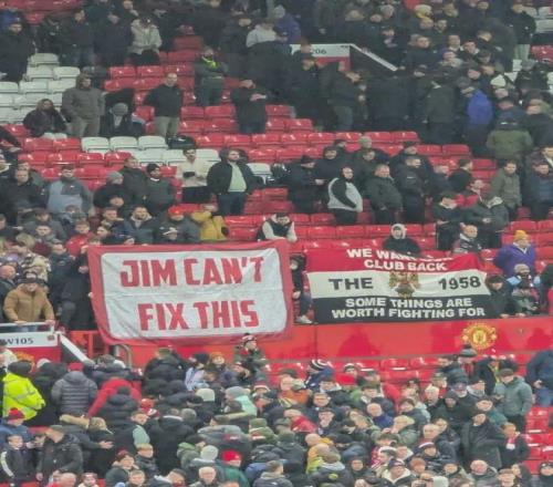 看臺上,球迷的橫幅刺痛了每一個紅魔擁躉的心:“吉米(拉特克利夫),解決不了這個”、“我們想要回我們的俱樂部”。