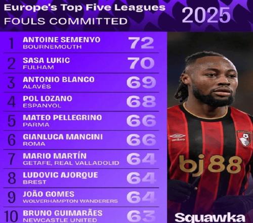 值得一提的是,在2025年,塞門約還是五大聯賽中犯規次數最多的球員。他的防守技術并不算好,但就是靠積極性來幫助球隊。