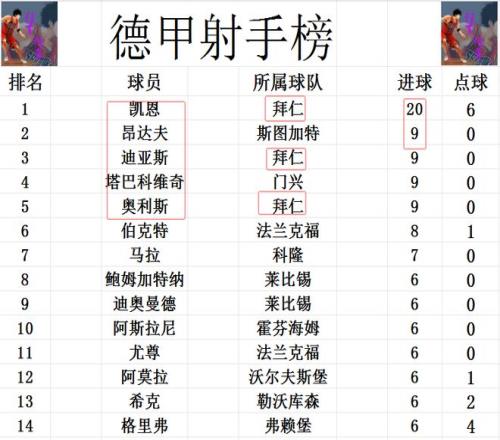 射手榜方面,凱恩傳射建功后,成為本賽季5大聯(lián)賽第2個(gè)進(jìn)球上20的球員,繼續(xù)遙遙領(lǐng)先。迪亞斯和奧利斯同時(shí)追上昂達(dá)夫和塔巴科維奇,4人9球并列第2,拜仁領(lǐng)先第二11分,凱恩也領(lǐng)先第二11球。