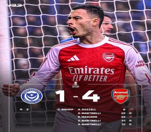 不過,槍手并沒有自亂陣腳,憑借角球得分的優勢,先后取得破門,半場2-1反超比分。易邊再戰,馬丁內利完場帽子戲法,最終,槍手客場4-1逆轉擊敗樸茨茅斯,晉級足總杯下一輪。