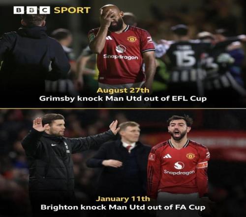 本賽季英聯杯第二輪,曼聯在點球大戰中被英乙球隊格林斯比淘汰。如今,曼聯在足總杯第三輪被布萊頓淘汰。