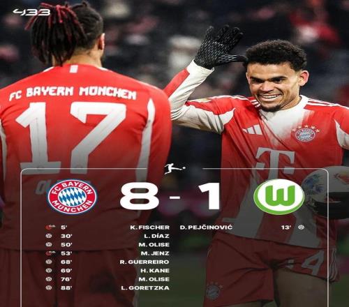 迪亞斯、延茨、格雷羅、凱恩、格雷茨卡先后破門,奧利塞梅開二度,最終,拜仁在主場8-1大勝沃爾夫斯堡,繼續領跑德甲積分榜。