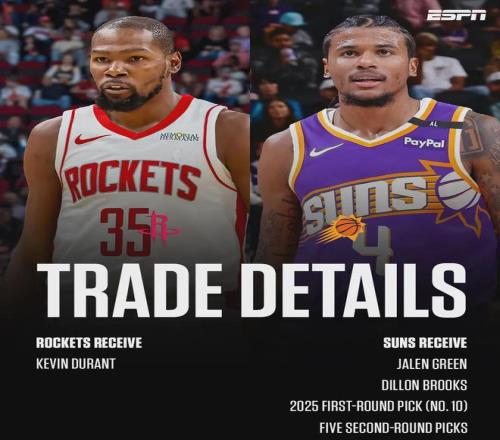 上賽季常規賽,火箭高居西部第2,如今變成西部第7。上賽季太陽僅排西部第11,連附加賽都沒進,如今太陽已經升至西部第6。2025年休賽期,火箭送出杰倫-格林、狄龍、2025年首輪10號簽和5個次輪簽,8換1交易得到杜蘭特。