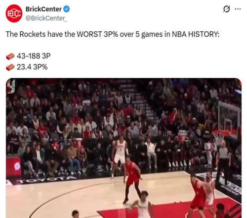 過去5場火箭三分合計188中43,命中率只有23.4%,創造NBA連續5場比賽三分命中率最差紀錄。