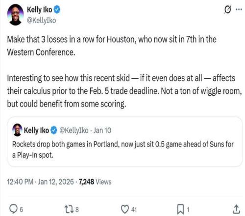 隊記Kelly Iko賽后直言遭遇3連敗后跌至西部第七,可能會讓火箭隊改變策略,重新考慮在2月份交易截止日前有所行動。