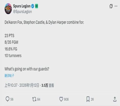 北京時間1月12日,NBA常規(guī)賽:馬刺103-104不敵森林狼。此役過后,馬刺27勝12負依然西部第二。森林狼26勝14負西部第四,領(lǐng)先第五湖人1個勝場。馬刺今天輸球,三后衛(wèi)必須背鍋,這哥仨投籃合計35中8,出現(xiàn)10次失誤。