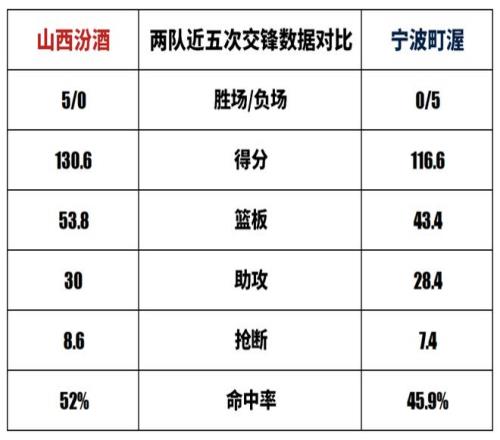 山西汾酒與寧波町渥歷史上一共交手9次,山西汾酒8勝1負。上賽季兩隊交手2次,山西汾酒2勝0負;本賽季兩隊交手1次,山西汾酒1勝0負。