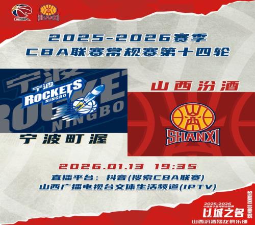 北京時間2026年1月13日19:35,2025-2026賽季CBA聯賽常規賽第14輪繼續進行,山西汾酒客場挑戰寧波町渥,球迷觀眾可以通過抖音(搜索CBA聯賽)、山西廣播電視臺文體生活頻道(IPTV)觀看比賽實況,在屏幕前與我們一起為山西汾酒男籃加油助威!