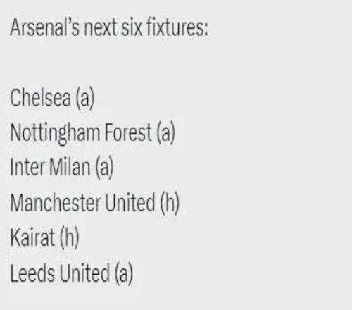 阿森納未來6場比賽:客戰切爾西、客戰諾丁漢森林、客戰國米、主戰曼聯、主戰凱拉特、客戰利茲聯。