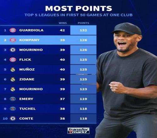 德國轉會市場統計了五大聯賽單一俱樂部主帥前50場聯賽的積分,并列出前50場聯賽拿分最多榜單,孔帕尼執教拜仁前50場聯賽拿到126分,僅少于瓜迪奧拉。