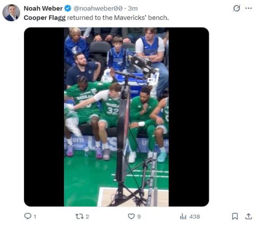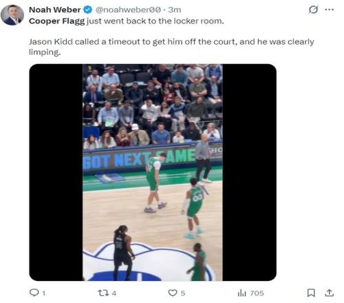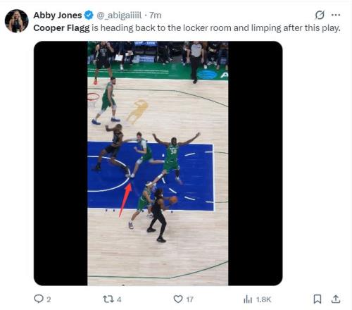 第三節弗拉格打了7分鐘,弗拉格在一次追防過程中左腳意外扭傷,隨后弗拉格一瘸一拐的走回了更衣室。獨行俠記者表示:基德主動叫暫停換下弗拉格,弗拉格的確是一瘸一拐的。