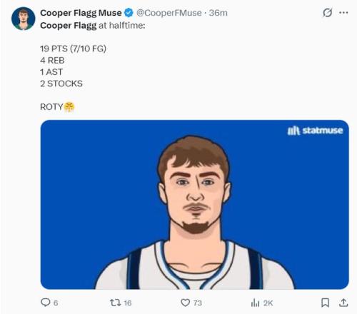 次節弗拉格更為爆炸,單節5中5+罰球2中2,各種高難度的后仰跳投命中,單節12分4籃板1助攻1蓋帽,半場弗拉格17分鐘,10中7+三分1中1,拿到19分4籃板1助攻1搶斷1蓋帽,獨行俠媒體盛贊最佳新秀。