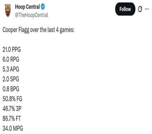 過去4場比賽,弗拉格場均出戰34分鐘,可以轟下21分6板5.3助2斷0.8帽,投籃命中率50.8%,三分46.7%,罰球86.7%。