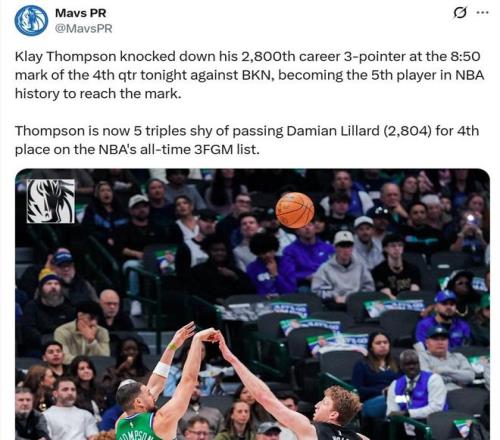 同時距離超越利拉德(2804記)升至NBA歷史三分命中榜第4位,僅差5記三分。