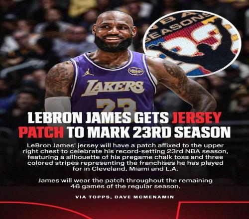 從對陣國王開始,詹姆斯球衣的右上角將固定縫制一個特殊補丁,圖案內容為一個他賽前標志性的撒鎂粉動作剪影,四道彩色條紋,分別代表他生涯的四個階段。