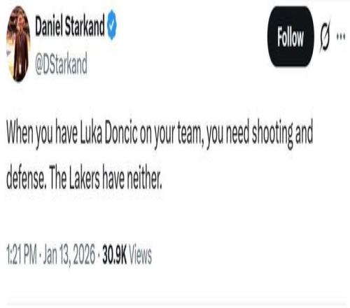 賽后湖人隊記Daniel Starkand一針見血的指出:“當你陣容中有東契奇這樣的球員時,你需要的就是投射能力和防守,而當下的湖人兩者都不具備。”