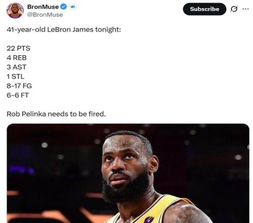面對這樣一場失利,賽后湖人媒體BronMuse曬出詹姆斯本場數據,17投8中拿下22分4板3助1搶斷,并配文:“佩林卡該被炒魷魚了。”