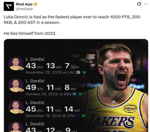 即便如此,憑借全場全能表現,東契奇本賽季已經拿到超過1000分200板200助,成功追平自己在2023年創造的29場最快紀錄。