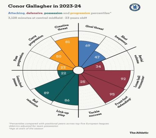 雖然他并非這支球隊所需的推進性傳球手,但加拉格爾在切爾西最后一個賽季的球員雷達圖顯示他具備有用的特質。在一個注重快速攻擊和轉換的球隊中,他在創造力威脅、持球和銜接配合方面排名靠前,同時在37場聯賽中攻入5球并助攻7次。