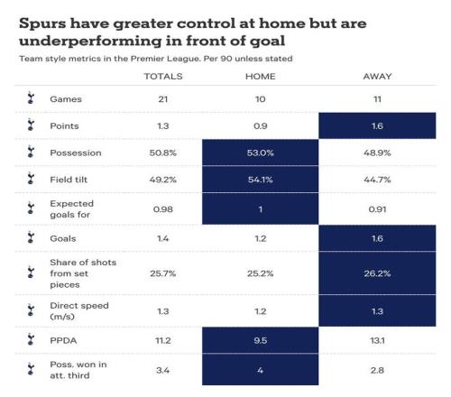 熱刺在推進進攻方面的掙扎,也在其主客場表現的差異中起到了作用。
