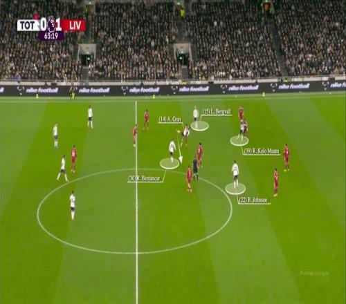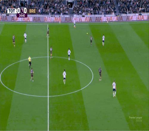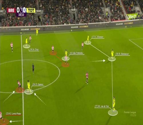 以下示例來自12月1-2負于利物浦的比賽,展示了這種進攻組織模式的一次成功運用。門將維卡里奧長傳至中場,阿奇-格雷將球點給羅德里戈-本坦庫爾。穆阿尼牽制住科納特,而布倫南-約翰遜和盧卡斯-貝里瓦爾的站位阻止了利物浦后衛的上搶。