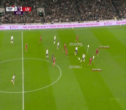 隨后本坦庫爾找到穆阿尼,后者轉身擺脫科納特并得以帶球向前,約翰遜的跑動則帶開了維吉爾-范戴克和米洛斯-凱爾凱茲,清出了一條通道。