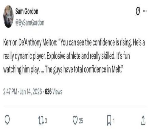 主帥科爾賽后也對梅爾頓大加贊賞:“你能夠看出梅爾頓在場上不斷提升的自信心,他是一名極具沖擊力,運動能力出色,技術也十分扎實的球員,看他打球真的是一種享受,我們都對他充滿信心。”