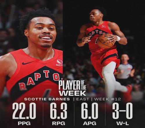 NBA官方宣布:猛龍的斯科蒂-巴恩斯當(dāng)選東部周最佳球員,巴恩斯上周場均22分6.3籃板6助攻,率領(lǐng)猛龍3勝0負(fù);掘金的佩頓-沃特森當(dāng)選西部周最佳球員,沃特森上周場均24.5分8籃板4助攻1.3搶斷1.8蓋帽,率領(lǐng)掘金3勝1負(fù)。