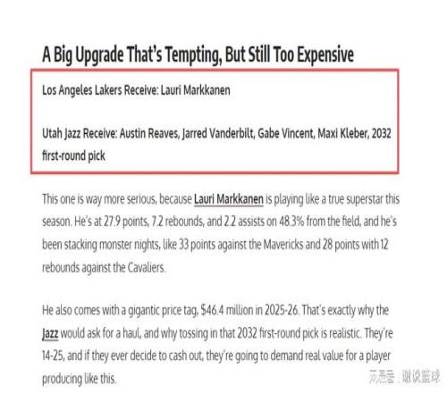 所以美媒認為如果難以留住里夫斯,或者給他開出續約合同,具備較大風險的話,倒不如把里夫斯送走,換來其他靠譜明星球員。于是美媒支招湖人,可以從爵士交易來當打球星馬爾卡寧,里夫斯成為主要籌碼,并且湖人還要送出三將文森特、克勒貝爾、范德比爾特再加上一個來自2032年的首輪簽。