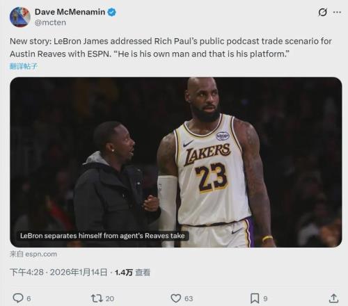現(xiàn)在不僅湖人管理層憤怒,里夫斯也不高興,所以詹姆斯必須回應(yīng)了。里夫斯和他的經(jīng)紀團隊站出來維護自己的權(quán)益,今天湖人對陣老鷹的比賽半場休息時,里夫斯的經(jīng)紀人雷吉-貝里找到里奇-保羅,兩個人在場邊聊了5分鐘左右。