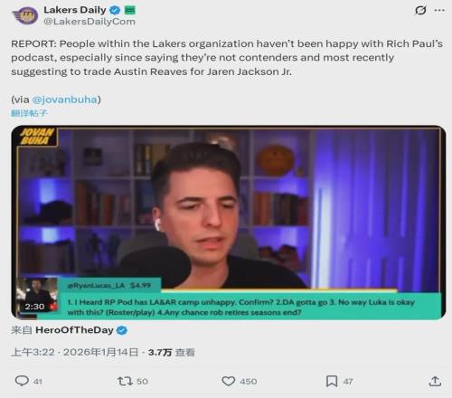 昨天里奇-保羅在自己的播客中說道:“如果我是湖人的管理層,我會聯(lián)系灰熊,用里夫斯在內(nèi)的交易方案,來換取小賈倫-杰克遜!”一個月前,里奇-保羅談到湖人的陣容時曾說:“我不認為湖人有機會進入西決,他們很容易被對手防住。”