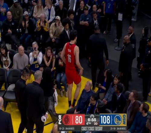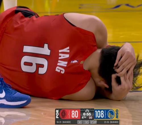 當然這場球最終也如大家所愿提前進入了垃圾時間,楊瀚森有比較長的時間可以登場。沒想到楊瀚森就打了兩個回合,就在一次倒地傳球中后腦勺撞到了對手的膝蓋,提前回到了更衣室。