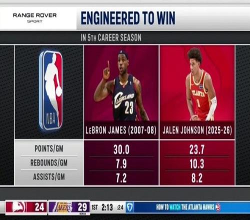 老鷹官推轉(zhuǎn)發(fā)核心杰倫與詹姆斯生涯第5季數(shù)據(jù)對比,杰倫得分遜色,但籃板與助攻均優(yōu)于同期詹姆斯。