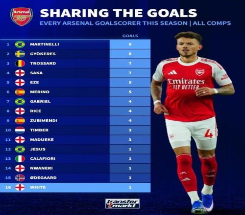 據統計,本賽季阿森納已有16人收獲進球,其中馬丁內利以9球領跑,約克雷斯貢獻8球,特羅薩德和各入7球,與梅里諾各有5球入賬,、賴斯、蘇維門迪均收獲4球,和各進3球,、、恩瓦內里、以及本·懷特則各有1球進賬。