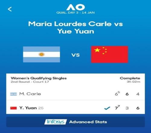 袁悅鏖戰(zhàn)3小時以2比1戰(zhàn)勝卡萊,晉級澳網(wǎng)女單資格賽決勝輪