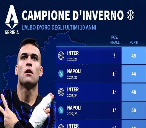 國米45分拿到意甲半程冠軍,此前9個賽季半程冠軍6隊最終奪冠